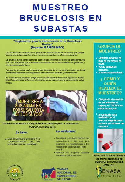 A partir del mes de Julio del 2019 se consolidó el apoyo a la iniciativa de Control Epidemiológico contra la Brucelosis Bovina, en conjunto con el SENASA y Subastas Ganaderas del país, para llevar a cabo los muestreos en los establecimientos de comercialización de todo el país, con la finalidad de encontrar bovinos portadores de la enfermedad, dar seguimiento a sus respectivas fincas de origen, y recurrir a procesos de saneamiento.